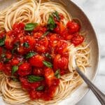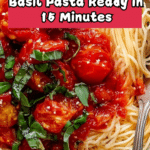 A fresh and vibrant 15-minute cherry tomato basil pasta featuring angel hair spaghetti tossed in a garlic-infused olive oil sauce with juicy quartered cherry tomatoes and fragrant basil. Perfect for a quick and flavorful weeknight meal.