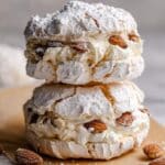 Two almond meringue cookies stacked on top of each other, each consisting of a rough, cracked white meringue layer dusted with powdered sugar on top and bottom. Between the meringue layers, there is a thick, creamy white filling with visible pieces of whole and sliced brown almonds scattered throughout. The stack is set on a light brown parchment paper over a white marbled surface. The texture looks crunchy on the outside with a soft creamy center. Photo taken with an iphone --ar 4:5 --v 7