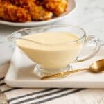 A clear glass gravy boat filled with smooth, pale yellow creamy sauce sits on a white rectangular plate with rounded edges. Beside the gravy boat on the plate lies a small golden spoon with a shiny surface. In the background, part of a white plate holds several pieces of breaded, golden brown crispy chicken, slightly blurred but visible. The scene is set on a white marbled textured surface, with a soft textured white cloth featuring black stripes placed under the chicken plate. Photo taken with an iphone --ar 4:5 --v 7