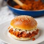 Chicken Parmesan Sloppy Joes combine the classic flavors of chicken parmesan in a fun and easy sloppy joe sandwich. Ground chicken is cooked with onions, marinara sauce, basil pesto, and Parmesan cheese, then served on toasted brioche buns topped with melted mozzarella cheese. This hearty and flavorful twist on a traditional sloppy joe is perfect for a quick weeknight dinner or casual gathering.