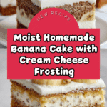 This moist and flavorful banana cake is a delightful way to use ripe bananas. Topped with a creamy cream cheese frosting, it’s perfect for any occasion, from a simple dessert to a special treat.
