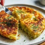 A round, golden-brown pancake with a slightly crispy texture and visible small chunks of light green vegetables is placed on a white plate with speckled gray detail. The pancake has one slice cut out and lifted slightly by a silver fork from the right side, showing a soft, shiny inside with layered pieces of the same light green vegetable. Small green herb sprigs are scattered on top, adding a fresh touch. The plate sits on a wooden board with a white marbled texture background. photo taken with an iphone --ar 4:5 --v 7