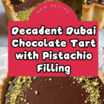 This luxurious Dubai Chocolate Tart with Pistachio Kataifi Filling combines a crisp shortbread crust with a rich pistachio kataifi layer and a smooth semi-sweet chocolate namelaka topping. The dessert features toasted shredded kataifi pastry infused with pistachio cream, layered under a luscious gelatin-set chocolate cream, garnished with roasted pistachios for added texture and flavor. Perfect for elegant gatherings or special occasions, this tart balances nutty, buttery, and chocolate flavors in a delightful multi-textured treat.