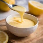 A close-up image shows a white bowl filled with a smooth, creamy lemon-yellow sauce. A silver spoon is lifting the thick sauce, which drips slowly back into the bowl. The bowl sits on a wooden board, with a blurred half lemon in the foreground and whole lemon nearby. The background is softly blurred with a white marbled texture. photo taken with an iphone --ar 4:5 --v 7