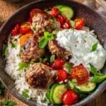 This Feta & Lamb Meatball Bake is a flavorful Mediterranean-inspired dish featuring tender lamb meatballs infused with cumin and lemon zest, baked with onions, tomatoes, butter beans, and topped with salty feta cheese. A perfect hearty meal that’s easy to prepare and serves well with a fresh green salad.