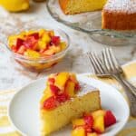 A single slice of light yellow cake with a soft and crumbly texture is placed on a white plate, dusted lightly with powdered sugar on top. On the upper part of the slice, there is a colorful fruit topping made of chopped orange peaches and red strawberries, some fruit pieces also rest beside the cake on the plate. In the background, a clear glass bowl filled with the same mixture of diced yellow peaches and red strawberries is visible, along with a larger round cake placed on a clear glass platter. The scene is set on a white marbled surface with a yellow and white striped cloth underneath, and a whole lemon is seen on the side. Near the foreground plate, two silver forks lie next to each other. photo taken with an iphone --ar 4:5 --v 7
