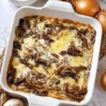 French Onion Chicken & Rice is a comforting one-dish meal that combines rich caramelized onions, tender chicken, creamy rice, and melted Gruyere cheese. This recipe features slow-cooked sweet onions infused with garlic, herbs, and a splash of brandy, layered over a flavorful mixture of sautéed mushrooms, spinach, and aromatic rice cooked in chicken stock and cream. Finished under the broiler for a golden bubbly top, this dish brings together classic French onion soup flavors in a hearty, family-friendly casserole.
