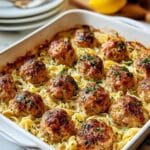 Keywords: Greek chicken meatballs, lemon orzo, Mediterranean chicken recipe, baked chicken meatballs, easy Greek dinner, healthy chicken recipe, lemon pasta, feta cheese meatballs, poultry recipe