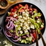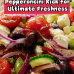 A fresh and flavorful Greek Salad featuring juicy cherry tomatoes, crisp cucumbers, tangy Kalamata olives, and creamy feta cheese, tossed in a zesty olive oil and red wine vinegar dressing with oregano and pepperoncini peppers. A perfect light meal or side dish that celebrates classic Mediterranean flavors.