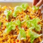 This Hamburger Casserole combines tender elbow macaroni, savory ground beef, and a tangy sauce loaded with pickles, ketchup, mustard, and Worcestershire sauce. Topped with melted cheddar cheese and crisp romaine lettuce, it’s a comforting dish perfect for family dinners or meal prep, delivering familiar cheeseburger flavors in a baked, hearty casserole form.