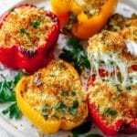 These herby ricotta stuffed peppers are a wonderful way to enjoy a flavorful, cheesy vegetarian meal. Filled with fresh spinach, aromatic herbs, and three kinds of cheese, they make a satisfying and colorful dinner or side dish.