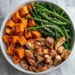 A flavorful and easy-to-make Honey Garlic Chicken and Sweet Potato recipe perfect for a quick, nutritious weeknight dinner. This dish combines tender marinated chicken breasts with roasted sweet potatoes and green beans, all baked together to create a deliciously sweet and savory meal.