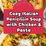Italian Penicillin Soup is a comforting and flavorful chicken soup featuring a rich aromatic vegetable base, tender shredded chicken, and small pasta simmered in a fragrant broth. Finished with fresh lemon juice, parsley, and a drizzle of extra virgin olive oil, this soulful soup is perfect served with crusty Italian bread and a sprinkle of Parmigiano-Reggiano cheese.