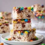Delight in these colorful and chewy M&M Rice Krispies Treats, a fun twist on the classic marshmallow cereal bars. Loaded with melty marshmallows, crunchy Rice Krispies, and festive M&M candies, these treats are finished with a smooth chocolate drizzle and topped with mini M&Ms for an extra pop of chocolatey sweetness and color. Perfect for parties, kid-friendly snacks, or anytime you want a nostalgic sweet treat with a playful crunch.
