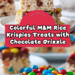 Keywords: Rice Krispies Treats, M&M Rice Krispies, marshmallow cereal bars, chocolate drizzle treats, easy dessert, kid-friendly snack, no bake dessert