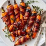 Keywords: maple bacon carrots, bacon wrapped carrots, roasted carrots, sweet and savory side dish, oven baked carrots