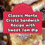 A classic Monte Cristo Sandwich featuring layers of ham, turkey, and Swiss cheese sandwiched between toasted, egg-dipped bread, finished with a dusting of powdered sugar and served with raspberry jam for a perfect balance of savory and sweet flavors.