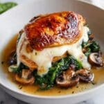 This Mushroom Stuffed Chicken Breast recipe features tender chicken breasts filled with a savory blend of sautéed mushrooms, garlic, thyme, and fresh spinach, topped with melted mozzarella cheese. The chicken is first seared to a golden brown on the stovetop, then baked to juicy perfection in the oven, making it a delicious and elegant main dish perfect for any dinner occasion.