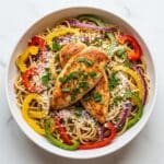This Olive Garden Chicken Scampi recipe features tender pan-fried chicken strips served over perfectly cooked thin spaghetti noodles, tossed with a flavorful sauté of bell peppers and onions in a creamy garlic lemon sauce enriched with white wine and chicken broth. A delicious and hearty dish combining bright, fresh flavors with creamy richness, perfect for a comforting dinner.
