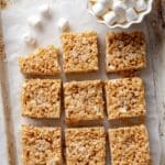 - Cut and Serve: Lift the bars out of the pan, place on a cutting board, and cut into bars. Serve and enjoy your delicious peanut butter Rice Krispie treats!
