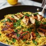 Persian-Style Chicken Pilaf is a fragrant, spiced rice dish featuring tender chicken, aromatic saffron, and a delightful mix of nuts and dried fruit. This comforting meal combines warm spices with the subtle sweetness of sultanas, making it a perfect centerpiece for any dinner.