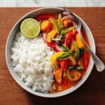 This vibrant Pumpkin Curry recipe features roasted kabocha squash combined with a fragrant Thai red curry paste and creamy coconut milk. The dish is enhanced with bell peppers, shallots, bamboo shoots, and aromatic Thai basil, making a delicious and colorful curry perfect for serving over steamed rice. It balances savory, spicy, and tangy flavors for a comforting yet exciting meal.