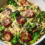 Keywords: chicken sausage, broccoli, orzo, quick dinner, weeknight meal, easy pasta recipe, one-pan meal, lemon Parmesan, healthy pasta