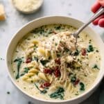 A comforting and creamy Quick White Lasagna Soup that combines tender chicken, flavorful sun-dried tomatoes, pasta, and spinach in a rich broth thickened with half-and-half and cornstarch. Topped with a blend of ricotta, Parmesan, and mozzarella cheeses, this soup captures the essence of classic white lasagna in a fast, easy-to-make meal perfect for chilly days.