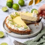 A slice of key lime pie is being lifted by a woman's hand from a white plate, showing three clear layers: a dark brown crumbly crust at the bottom, a thick pale yellow creamy filling in the middle, and a white whipped cream layer on top, decorated with light brown toasted spots and garnished with thin lime slices around the edges and in the middle. The pie sits on a white plate on a white marbled surface with whole and halved limes scattered nearby, alongside two silver forks and a green cloth, while some green-yellow leaves hang at the top right corner of the image. Photo taken with an iphone --ar 4:5 --v 7