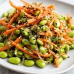 - Assemble and Dress the Salad: In a large bowl, combine the dried edamame, snap peas, and shredded carrots. Pour prepared dressing over the vegetables and toss gently but thoroughly to coat evenly.