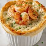 A white ramekin is filled with a layered shrimp dish. The bottom layer is creamy white sauce with specks of red, topped with five large cooked shrimp that are pink with slight orange and white highlights. These shrimp are partially covered with a golden-brown biscuit crust that is textured and slightly crumbly, rising above the ramekin’s edge. The dish is garnished with small green herbs and sprinkled black pepper, all set on a white marbled surface. photo taken with an iphone --ar 4:5 --v 7