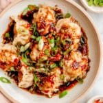12. Step 12: Garnish with chopped cilantro, sliced green onion, and sesame seeds. Serve warm with the dipping sauce and enjoy!
