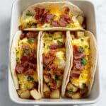 Keywords: breakfast tacos, baked breakfast recipe, bacon breakfast, scrambled eggs, seasoned potatoes, Mexican breakfast