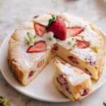 This classic French Strawberry Cake is a moist and tender treat bursting with fresh strawberries and a hint of vanilla. Featuring a soft, buttery crumb enriched with sour cream and topped with a sweet sugar crust, this cake is perfect for spring and summer gatherings or any time you crave a light, fruity dessert.