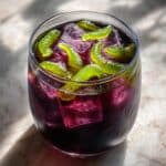 A short clear glass filled with a dark purple liquid layered with irregular ice cubes that have a light purple tint. On top, several bright green gummy worms are placed, their ridged texture clearly visible as they rest on the ice. The glass sits on a surface with a white marbled texture, and sunlight subtly highlights the drink’s glossy surface and casts soft shadows. photo taken with an iphone --ar 4:5 --v 7