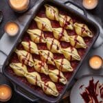 Zombie Guts Stuffed Shells is a visually striking and delicious pasta dish featuring jumbo pasta shells filled with a creamy cheese mixture, baked in a vibrant beet-infused tomato sauce. The dish is finished with optional balsamic glaze or black garlic oil to create a spooky, dark ‘vein’ effect, perfect for themed dinners or a creative family meal.